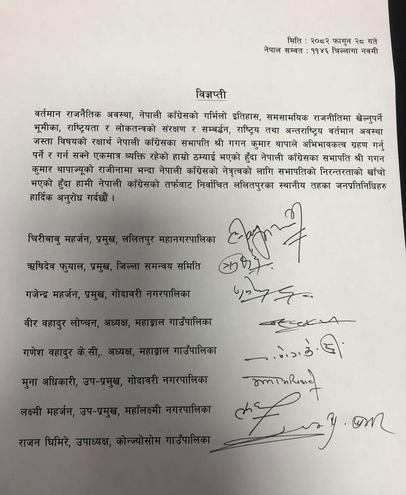 बिहीबार एक संयुक्त प्रेस विज्ञप्ति जारी गर्दै उनीहरूले वर्तमानको जटिल राजनीतिक परिस्थितिमा थापाको नेतृत्व र अभिभावकत्व पार्टीका लागि अपरिहार्य रहेको उल्लेख गरेका छन्। नेपाली कांग्रेसको गरिमामय इतिहास, राष्ट्रियता र लोकतन्त्रको संरक्षणका साथै समसामयिक राजनीतिमा प्रभावकारी भूमिका खेल्न सक्ने एक मात्र योग्य व्यक्तित्व थापा नै भएको दाबी गर्दै उनीहरूले पछिल्लो समय चर्चामा आएको राजीनामाको विषयलाई पूर्णतः अस्वीकार गरेका छन्।
