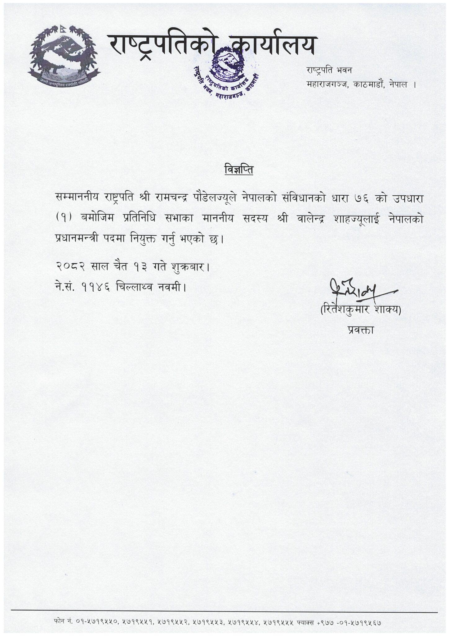 राष्ट्रपति रामचन्द्र पौडेलले बालेन्द्र शाहलाई नेपालको ४७ औँ प्रधानमन्त्रीको रूपमा नियुक्त गर्नुभएको छ। संसदको सबैभन्दा ठूलो दल राष्ट्रिय स्वतन्त्र पार्टी को संसदीय दलका नेतालाई राष्ट्रपति पौडेलले संविधानको धारा ७६ को उपधारा १ बमोजिम प्रधानमन्त्री नियुक्त गर्नुभएको हो।