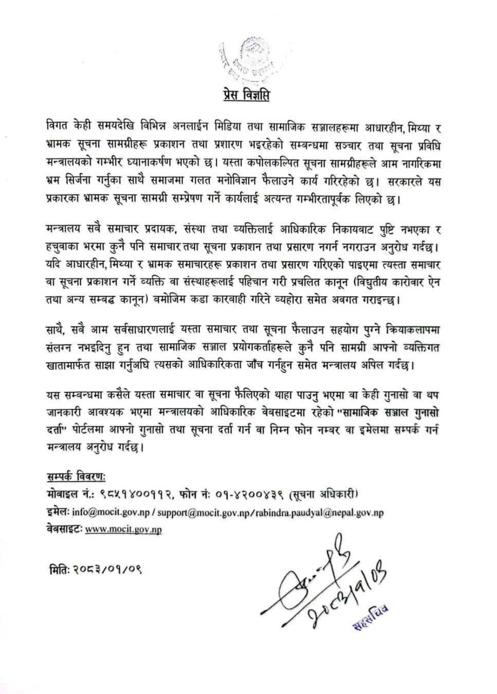 काठमाडौं, वैशाख १० । सञ्चार तथा सूचना प्रविधि मन्त्रालयले अनलाइन मिडिया र सामाजिक सञ्जालमा फैलिरहेका अपुष्ट, भ्रामक र तथ्यहीन समाचारप्रति गम्भीर ध्यानाकर्षण भएको जनाउँदै त्यस्ता गतिविधि नगर्न कडा चेतावनी दिएको छ।