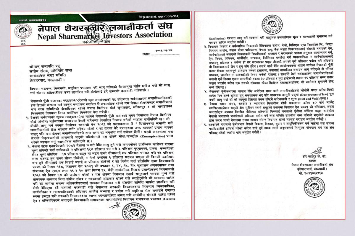 काठमाडौं, वैशाख ७ । नेपालको पुँजी बजारमा हालै लागू गरिएका नीतिगत व्यवस्थाहरूलाई गैरकानूनी, षड्यन्त्रपूर्ण र स्वार्थ समूहको प्रभावमा ल्याइएको आरोप लगाउँदै नेपाल शेयरबजार लगानीकर्ता संघले संघीय संसद, प्रतिनिधि सभा अन्तर्गतको सार्वजनिक लेखा समितिमा निवेदन दिएको छ ।